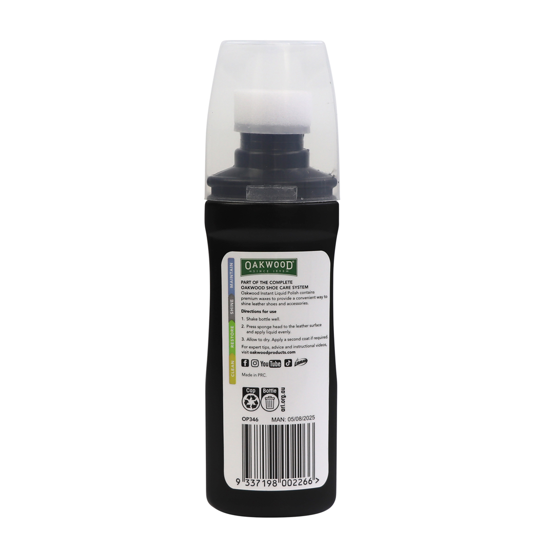 Oakwood Instant Liquid Polish Black 75ml contains quality rich, nourishing dyes and premium waxes in a convenient and easy to use applicator bottle.
