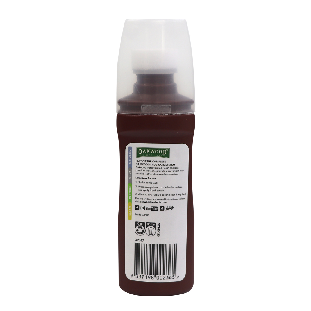 Oakwood Instant Liquid Polish Brown 75ml contains quality rich, nourishing dyes and premium waxes in a convenient and easy to use applicator bottle.